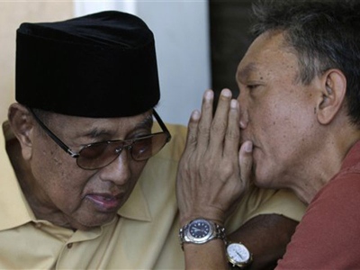 GAMBAR fail menunjukkan Jamalul Kiram III (kiri) mendengar sesuatu yang diperkatakan oleh pengikutnya di rumahnya di Kampung Maharlika, bandar Taguig baru-baru ini.